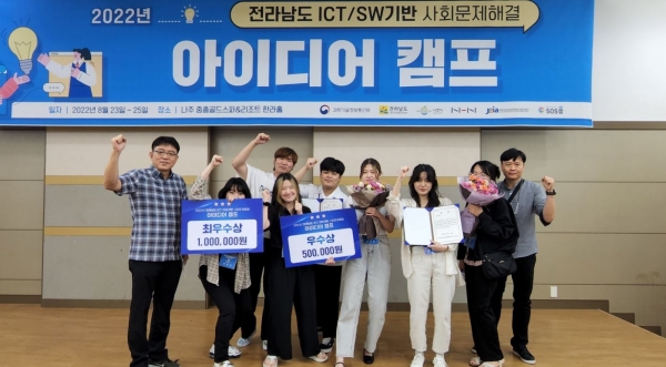 청암대학교(총장직무대행 오미성) 컴퓨터정보융합과(학과장 최우진) 교수 및 학생들이 지난 8월 25일 나주 중흥골드스파에서 거행된 「2022년 전라남도 ICT/SW기반 사회문제해결 아이디어 캠프」에 참여하여 최우수상 및 우수상을 받았다. 이번 캠프는 전라남도와 나주시가 주최하고 (재)전남정보문화산업진흥원이 주관하였으며, NHN엔터프라이즈가 공동주관하여 전라남도에서 발생하는 다양한 사회문제를 해결하기 위한 아이디어를 ICT/SW를 통해 전라남도 내에서 실증이 가능한 형태로, 캠프 기간 내 프로토타입을 개발하는 해카톤 대회 방식의 캠프이며, 대상 및 최우수상 선정팀에게는 NHN엔터프라이즈 입사 시 가점이 부여된다.