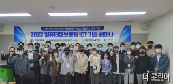 [더코리아-전남 순천] 청암대학교(총장직무대행 김성홍) 컴퓨터정보융합과(학과장 최우진)는 지난 11월 11일 청암대학교 정보과학관에서 「2022 컴퓨터정보융합 ICT 기술 세미나」를 개최하였다. 이번 세미나는 청암대학교 컴퓨터정보융합과에서 주최하고 청암대학교 기업재난안전관리전문인력양성사업단과 ㈜미래정보가 공동 주관하여 학생의 관점에서 IT 전문기업에 취업 하기 위해 가져야 할 마음가짐 및 자기계발의 필요성에 대하여 설명하고, 지역의 ICT 관련 기업 대표와 전산 담당자를 위한 웹 방화벽 보안 기술에 대한 강연을 진행하였다.