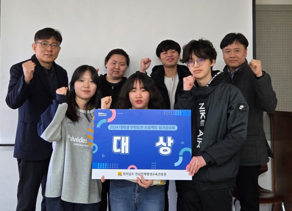 청암대학교 컴퓨터정보융합과(학과장 최우진) 학생들이 지난달 27일 목포 샹그리아비치호텔에서 열린 2024 대학생 무한도전 프로젝트 성과공유회에서 대상을 수상했다.